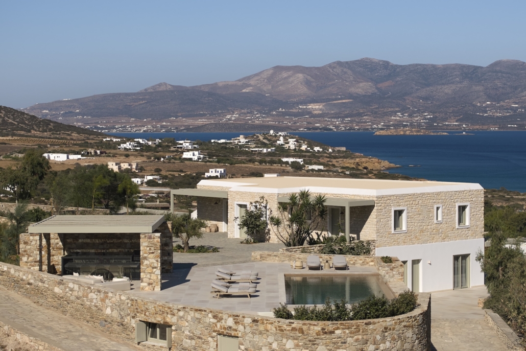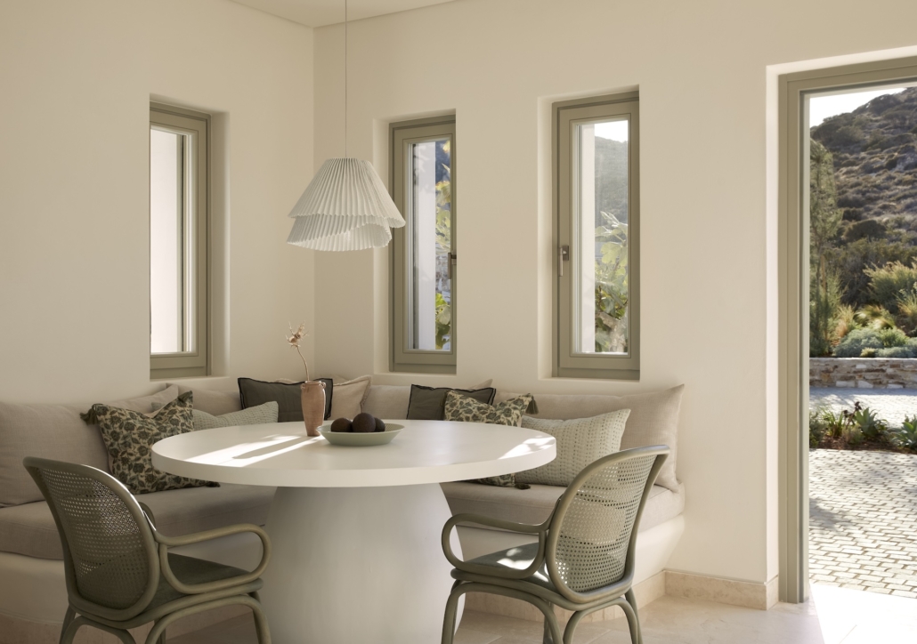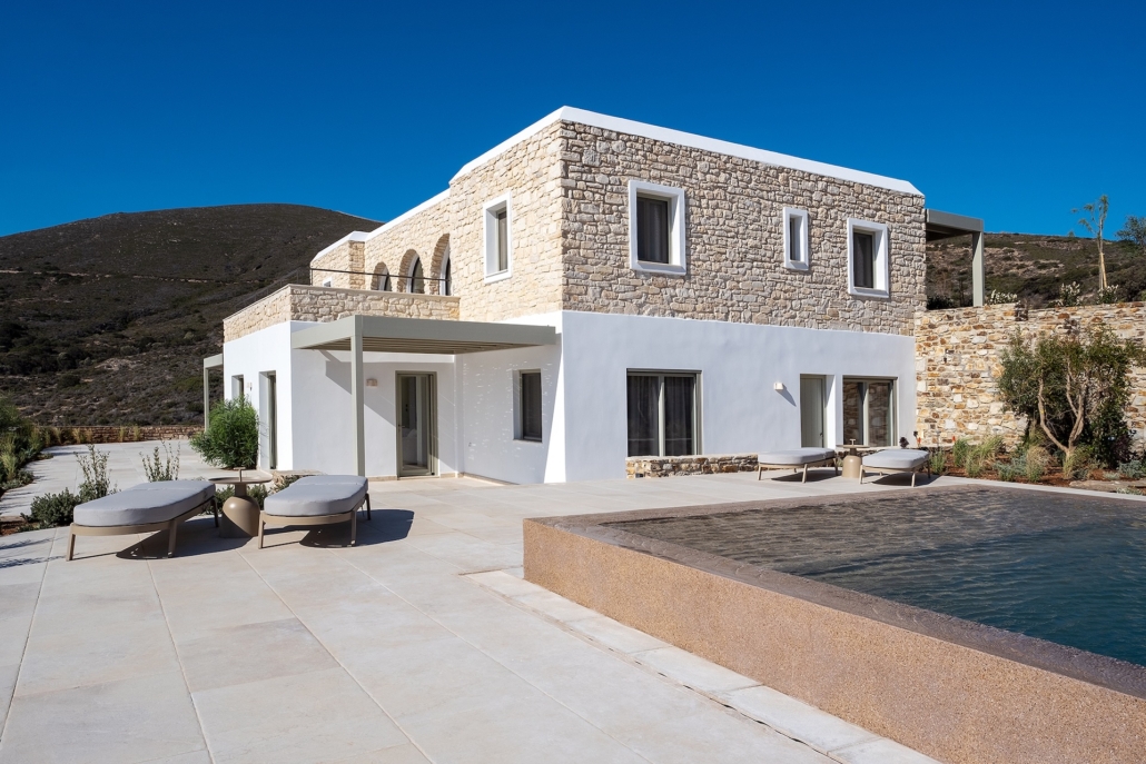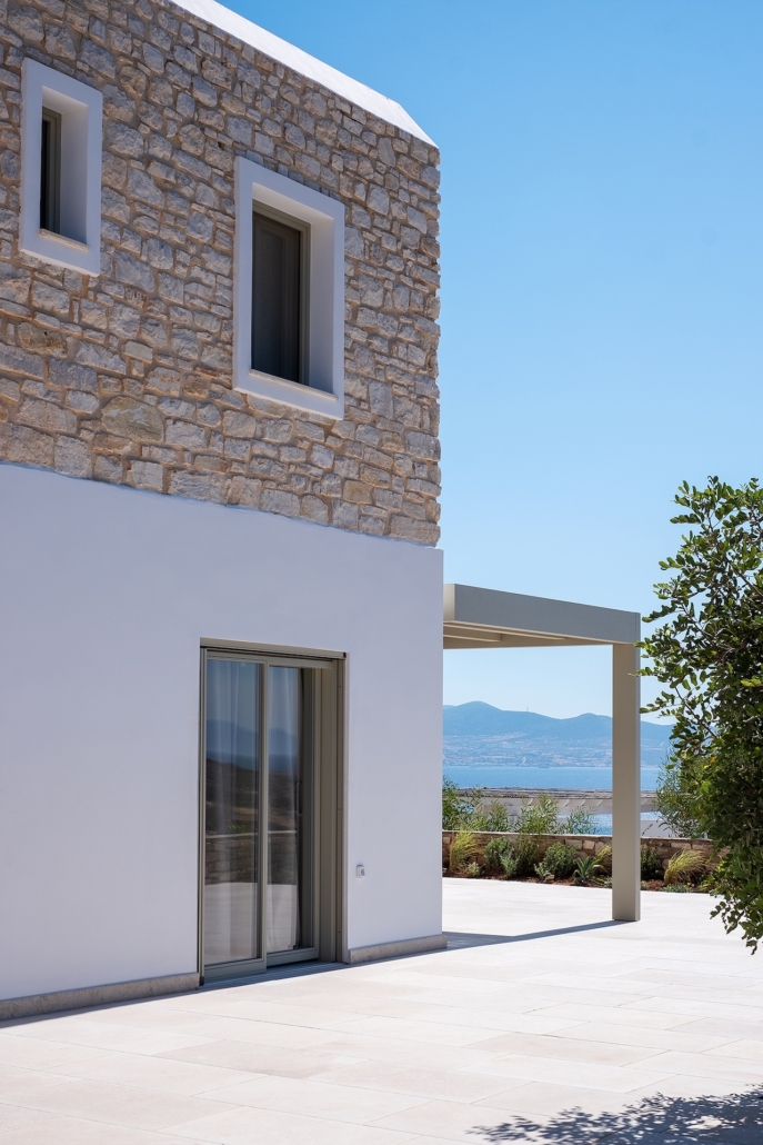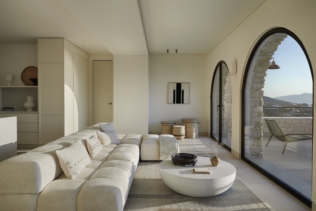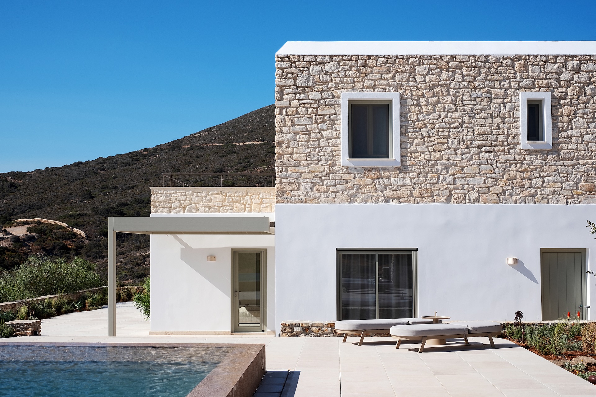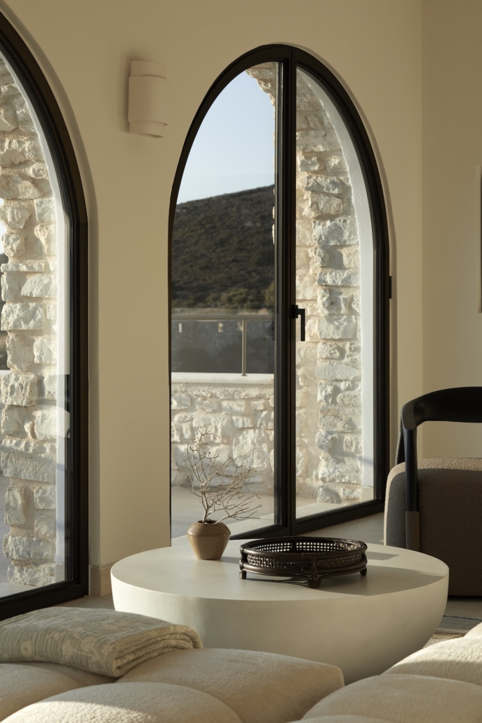 An impressive, luxurious holiday residence in Antiparos, featuring HAUFEN® wooden frames and the Italian Ponzio’s minimal arched aluminum system from the WS75IL series.