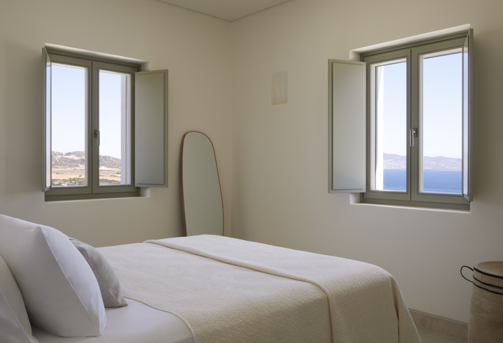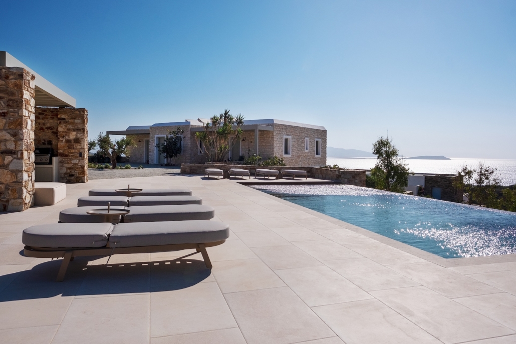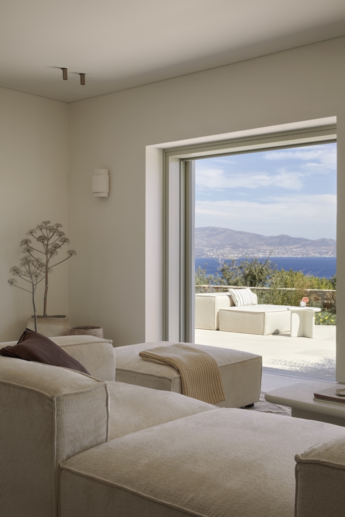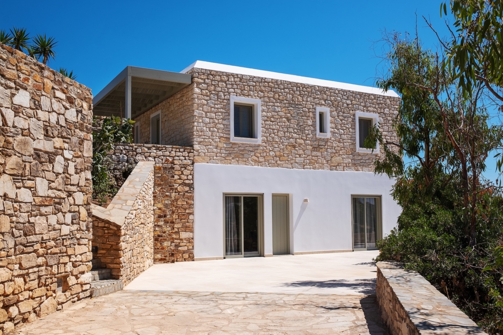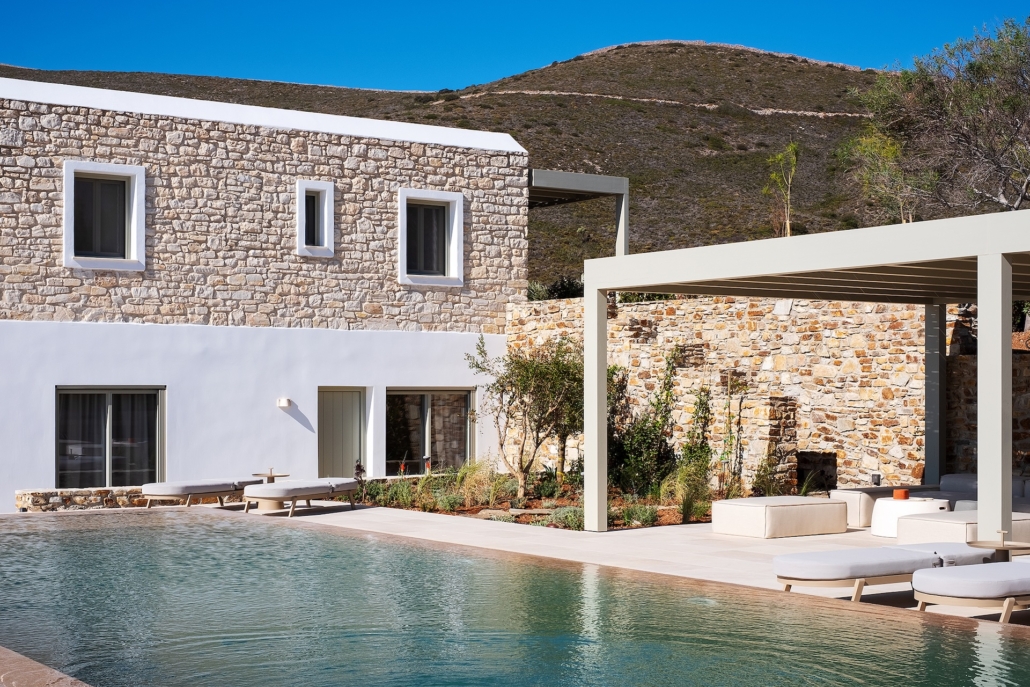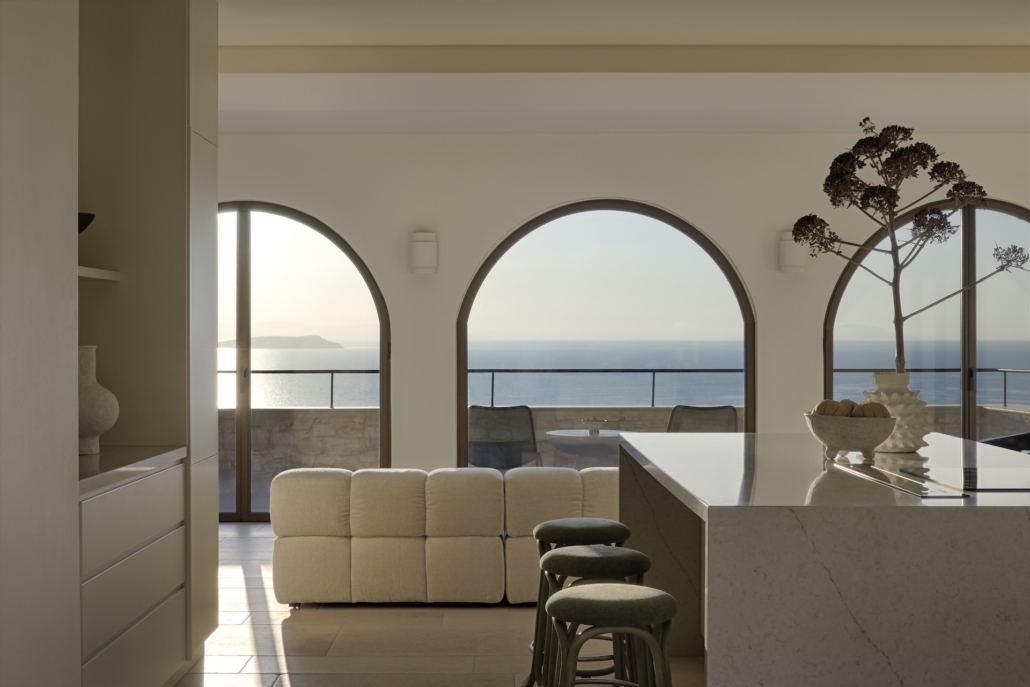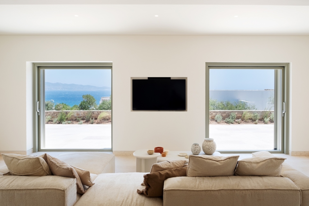 An impressive, luxurious holiday residence in Antiparos, featuring HAUFEN® wooden frames and the Italian Ponzio’s minimal arched aluminum system from the WS75IL series.